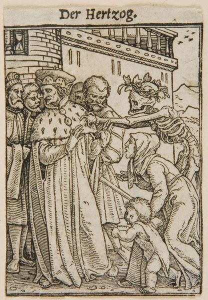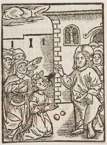 Curator: What a wonderfully strange scene! It’s like a dream… or perhaps a nightmare. The lines are so stark, and yet the composition has a bizarre sort of energy. Editor: This is an illustration from Brant's *Navis Stultifera*, or *Ship of Fools*, a late 15th-century satire. It critiques societal norms through the lens of folly, depicting various "fools" and their vices. Curator: Ah, that explains the central figure in the jester's hat! He definitely has a manic energy about him, doesn’t he? Like he's trying to pull us into his world of absurdity. Editor: Exactly! The anonymous artist uses the woodcut medium effectively to convey the chaos and moral decay Brant critiques. Note how the architectural setting almost leans in on the figures. Curator: It feels like a stage, doesn't it? We’re all players in this comedy – or tragedy – of errors. Perhaps that's why it resonates even today; we’re all a little foolish sometimes. Editor: Indeed, the work taps into the timeless human condition, inviting us to reflect on our own follies and the societal structures that perpetuate them. The critique lives on!
