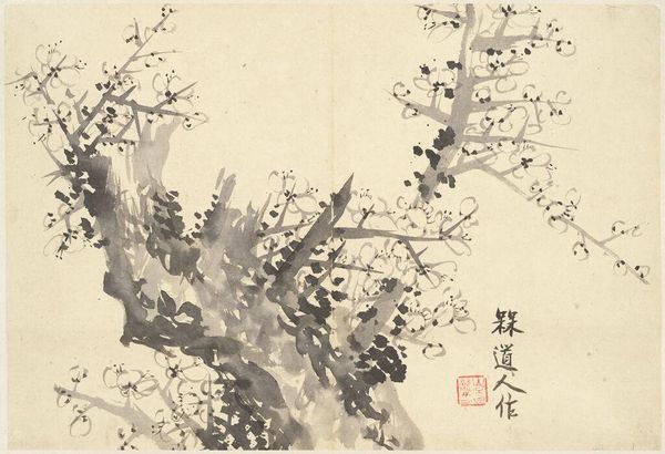 Curator: This scroll painting, now in front of us, is titled "Blossoming Plum" by the artist Cho HÅi-ryong. It employs ink on paper, presenting a study in monochrome elegance. Editor: The immediate impression is one of stark beauty—a quiet, almost melancholic grace in its composition. The contrasting shades of gray create a surprisingly dynamic visual experience. Curator: Absolutely, the artist's control of ink wash is masterful. Consider the bare branches and delicate blossoms; they form a visual rhythm, creating balance between emptiness and fullness, Yin and Yang. Editor: I find it intriguing how the blossoming plum often symbolizes resilience and perseverance, especially during times of adversity. Here, its stark presentation could reflect societal challenges of the time. Curator: Perhaps, but let's also appreciate the formal qualities. The calligraphic inscription, integrated into the composition, adds another layer of complexity to the work's texture and meaning. Editor: Indeed, by situating such works in broader historical contexts, we can better understand how notions of identity and resistance have influenced artistic expression. Curator: Agreed, and by paying attention to the relationship between the brushstrokes and the paper, we witness an elegance transcending simple representation. Editor: Overall, this piece speaks volumes about the interconnectedness of nature, culture, and the enduring human spirit.