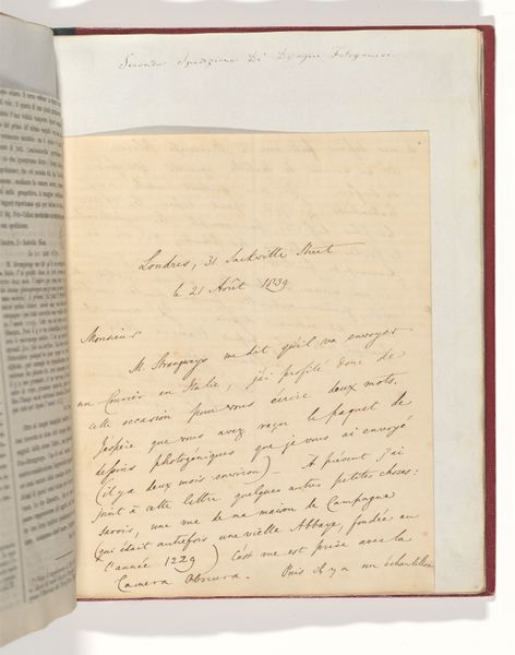 Curator: Here, we have a photographic reproduction of a drawing dating from before 1908. The drawing depicts the gravestone of Govert Cornelis Gevers in the old Saint Victor Church in Batenburg. Editor: It gives me a melancholic feeling, doesn't it? The faded ink on the aged paper, the almost ethereal quality of the image... it speaks of remembrance and loss. Curator: Precisely. Note the meticulous hand-lettering. The contrast between the cursive script and the more formalized inscription contributes to the overall composition. Editor: And the text on the left page – it looks like notes, perhaps observations made by the artist. The act of documentation itself takes on symbolic weight. Were these notes important to the original artist? I mean what does script typography entail? Curator: Undeniably. Notice how the composition guides your eye—the centered inscription on the right is balanced by the flowing text on the left, creating a dynamic tension within the open book format. And indeed that acts as the focal point of the artwork Editor: And then the shield! It could represent the Gevers family. Those symbolic shields are fascinating windows into history, hinting at lineage and perhaps achievements. They evoke this visual language's cultural and personal context, what story does this lineage present, who was the persona of the symbolized character and those that relate. Curator: The graphic quality of the entire spread—the interplay of line, form, and texture—speaks to a deliberate artistic intention to present death as a beautiful phenomenon. Editor: The drawing feels almost reverent. Like an act of honoring the deceased by carefully preserving a fragment of their physical presence, which in fact is their epitaph for remembrance. Curator: Yes. A delicate balance is achieved with the help of ink and the material substrate that elevates a somber historical document. Editor: Thinking about death across cultures always makes you think. Even through reproductions like this one, the image prompts introspection. Curator: It surely does. The reproduction acts as a portal to reflect upon temporality through an older, mediated form.