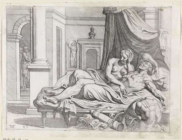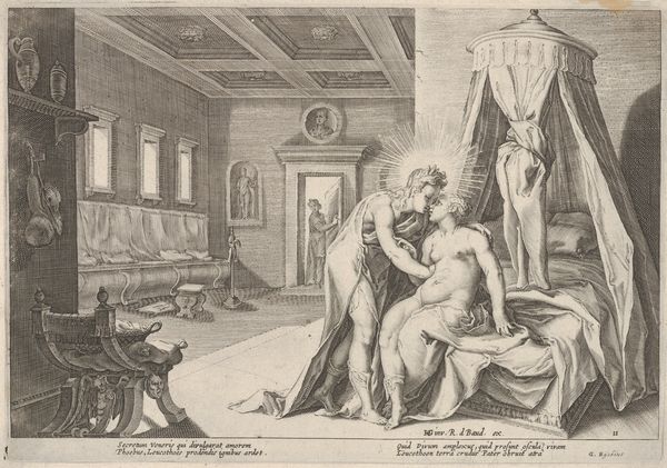 Cornelis Cort created this print, "Joseph and Potiphar's Wife," in the 16th century. The composition immediately draws you in with its dynamic arrangement of figures and the intense contrast of light and shadow. Notice how the scene is structured to highlight the tension between the characters. Potiphar's wife reclines seductively on the bed, her form rendered with soft, flowing lines that emphasize her sensuality. In stark contrast, Joseph is depicted in mid-motion, his body angled away, the lines of his figure are sharp and urgent, conveying his frantic attempt to escape. Cort masterfully uses the contrast between these figures to explore themes of morality, desire, and power. The detailed cross-hatching not only defines the forms but also adds depth and texture, enhancing the emotional weight of the scene. This engraving doesn't just depict a biblical story; it uses form and structure to pose enduring questions about human nature and ethical choices.