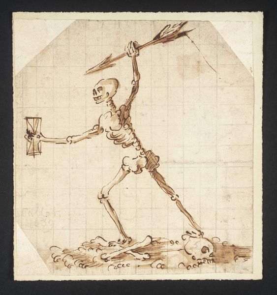 Gesina ter Borch created this drawing of a skeleton dancing next to an open grave with pen in brown ink. The stark contrast between the dark ink and the untouched paper creates a visually striking image. The composition features a dancing skeleton, which immediately captures our attention, set against the backdrop of death. The skeleton, an archetypal symbol of death, is drawn with precise lines, yet it is caught in a lively dance. In one hand it holds an arrow, in the other, an hourglass. These symbols are not just representational, they question the boundaries between life and death. Ter Borch masterfully manipulates the linear form to convey movement, creating a semiotic dialogue between mortality and vitality. This subverts traditional notions of death as a solemn, static event, and prompts a re-evaluation of these polar opposites.