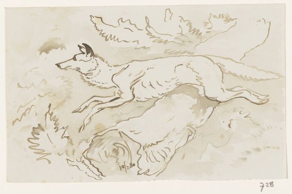 This is "Haas", a swift, small drawing by Johannes Tavenraat. It was made in the 19th century when the Netherlands was undergoing significant social and political change, grappling with its colonial past, and redefining its national identity. The hare is depicted in motion, almost as if it is escaping. In Dutch art, animals often symbolized aspects of human character or social commentary. Here, the hare, a creature often hunted, might represent vulnerability or the struggle for survival. Consider the emotional context of the time. Perhaps Tavenraat was exploring themes of freedom, resilience, or the impact of societal forces on individual lives. The simplicity of the sketch evokes a sense of immediacy and raw emotion. This piece invites us to consider how historical contexts and personal experiences are interwoven in art, reflecting both the broader societal issues and the intimate feelings of the artist.