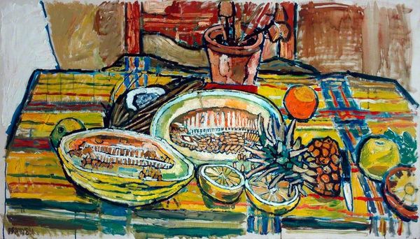 John Bratby made this painting, ‘Holyland’, in August 1961, with what looks like oil on canvas, creating a scene bursting with color and texture. It’s like he dove headfirst into the act of painting, each brushstroke a bold declaration. Looking at this piece, you can almost feel the thickness of the paint, the way it sits on the canvas, capturing the roughness of the melon's skin and the jagged edges of the pineapple. The colors are intense, almost vibrating against each other, mirroring the energy of a bustling marketplace. Take that cut pumpkin, for instance – the way Bratby layers oranges and whites, it's not just a pumpkin, it’s a tiny universe, each seed a star. Bratby reminds me of another painter, Joan Brown, who also had a fearless approach to color and form. Both artists show us that painting is about more than just representation; it's about feeling, about translating the world into something intensely personal and alive.