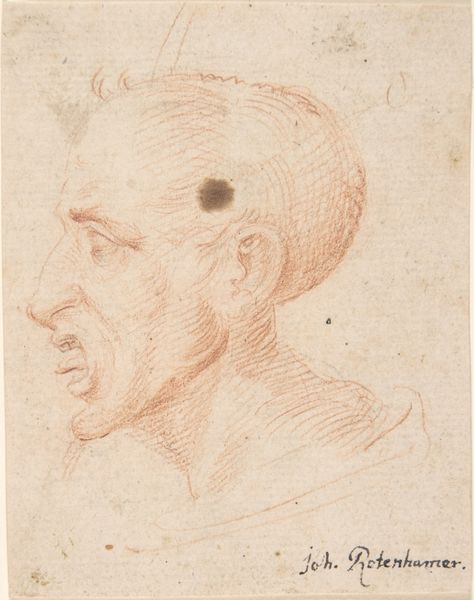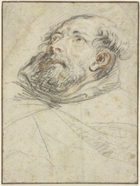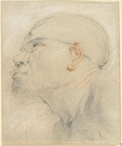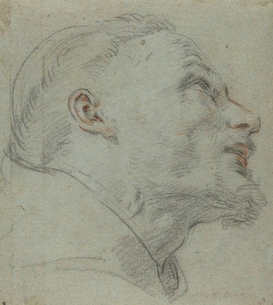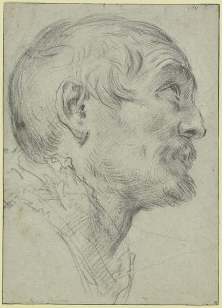Gaspar de Crayer rendered this head of a man with an upstanding collar in a profile facing left, using black chalk. The stark contrast between the strong lines defining the man's features and the softer shading of his hair and collar immediately grabs our attention. De Crayer’s use of line isn't just descriptive; it's structural. Notice how the firm strokes map out the planes of the face, creating volume and depth, while softer, more diffuse lines suggest the texture of the hair and fabric. This interplay between precision and suggestion is further emphasized through the limited tonal range of the chalk. The composition isn't merely a portrait, but also an exploration of form and light. By focusing on the profile, de Crayer reduces the subject to its most essential lines and shadows, inviting us to consider the formal qualities of the drawing itself. Through this delicate balance of line and shadow, the artwork invites us to see beyond the subject and contemplate the very essence of representation.