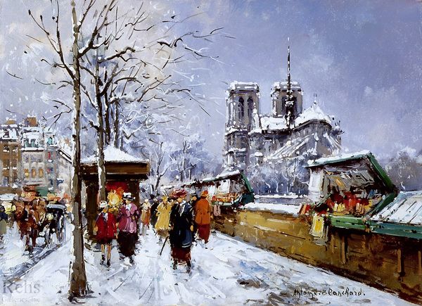 Edouard Cortes painted 'Bouquinistes de Notre Dame' using oil on canvas. It captures a quintessential Parisian scene. Cortes, born in France in 1882, painted this scene when the open-air book market known as 'bouquinistes' was already an entrenched cultural institution along the Seine. Here, against the backdrop of the iconic Notre Dame Cathedral, we see Parisians browsing books and prints from these unique vendors. These book stalls have been a part of Parisian life since the 16th century but have become a symbol of French intellectual and artistic life, and have helped define Paris as a center of culture. The bouquinistes offered access to literature and art that had been marginalized by the official institutions of publishing and art. Historians examine these stalls as public spaces, where the circulation of ideas and the democratization of art occurred. They were a counterpoint to the elite art market and state-sponsored academies.