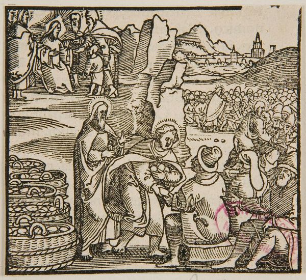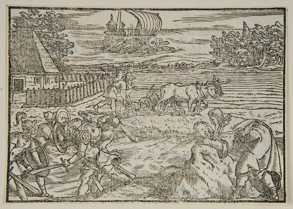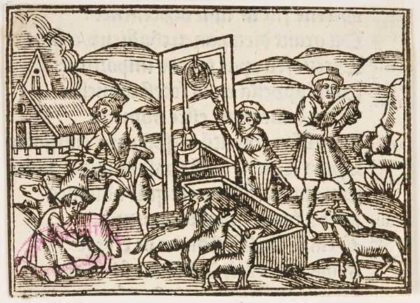 Editor: Here we have the anonymous woodcut, "Shepherds and their Flock." The textures created by the lines are striking. What can you tell me about this piece? Curator: Well, consider the labor involved in carving the woodblock itself. Each line painstakingly etched, mirroring the shepherd’s own work. Notice how this process elevates a common scene of labor to art. What does that say about consumption of images versus the realities of rural life? Editor: So it’s about highlighting the value of everyday work through the very act of its creation? That’s fascinating! Curator: Exactly. And where might this image have been consumed? Was it for the wealthy, or for a broader segment of society?