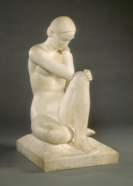 Curator: There's such a contemplative mood emanating from this work, isn't there? That polished marble and subtly tilted head—almost sorrowful. Editor: Indeed. What strikes me most is its simplification. This is Constantin Brâncuși’s "Muse," sculpted in 1912. Look how he pares down the human form, particularly the facial features, into near-geometric abstraction. Curator: The lack of eyes especially. It creates an inward focus. You feel like you're glimpsing the essence of thought itself, a mind withdrawn from the external world. But tell me, what sort of "muse" do you think Brancusi had in mind? Editor: That's the million-dollar question, isn't it? Brâncuși was deeply invested in Romanian folk traditions, which could be informing this stylized form. We have to remember that at this time, Paris was buzzing with different influences from colonies as well as interests in ancient sculpture traditions. Perhaps it represents the universal idea of inspiration rather than a specific figure, reflecting modernism's quest for fundamental forms. Curator: I think you’re right. The choice of marble also elevates it beyond mere portraiture. The cool, smooth surface invites touch, but the abstraction keeps you at a distance. The way the neck seems to merge with the head gives the sculpture such unity. Editor: The institutional framing of Brancusi as a forerunner of abstract art solidified his importance and influence throughout the twentieth century, but it wasn't an immediate process. As an émigré in Paris, his early struggles reflected the challenges of integrating into an art world with rigid structures and tastes. Now, of course, this piece sits firmly within a canon of essential Modernist sculptures. Curator: And yet, even within that established context, "Muse" still invites such personal responses. Editor: Yes, the enduring power of that abstract visage. A true success in invoking deeper feeling beyond the literal.