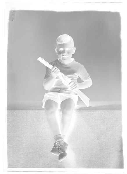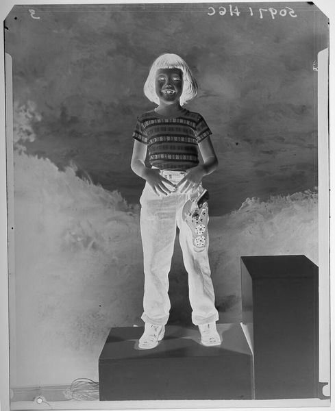 Curator: This is an intriguing work, an "Untitled Portrait of Boy in Baseball Uniform" by Lucian and Mary Brown. It is a gelatin silver print. Editor: It has an unsettling, almost ghostly feel to it, perhaps due to the reversal of tones. But there's also a quiet confidence in his stance. Curator: Considering its likely origin within a studio setting, the photograph speaks to broader cultural narratives of youth, sport, and identity construction, particularly in mid-20th century America. Editor: Exactly. The baseball uniform becomes a symbol, not just of recreation, but of belonging and aspiration, deeply intertwined with notions of masculinity and community. Curator: The Browns were commercial photographers. So thinking about their studio practice adds another layer to how images are constructed. Editor: Right. I wonder about the boy, though. Did he feel the weight of those expectations? Curator: That ambiguity is precisely where the power lies. Editor: It makes you think about how images shape identity, doesn’t it?