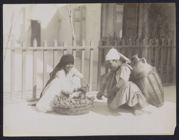 Curator: Well, the first thing that strikes me is how still it is. Both the barber and the boy seem frozen in time. What do you see? Editor: Absolutely. We're looking at "Indian Barber," a gelatin-silver print dating back to the 1860s. It’s the work of Willoughby Wallace Hooper and offers us a glimpse into a moment in time, carefully staged yet somehow raw. I love the textures in the weaving of that cot. Curator: Raw, yes, I'd agree. It makes me wonder about the stories, you know? What was life like for that barber, for that boy? Is that ritual a rite of passage? It’s a tender kind of portrait, almost voyeuristic, caught in that intimate space. I suppose there's that underlying tension with documentary photography and colonial gaze going on as well. Editor: There’s certainly a calculated arrangement to consider; note how the barber's dark clothing sharply contrasts against the white wall and the fair complexion of the seated boy, and the barber’s lean forward creating diagonal that runs along the spine and toward the back of the young man’s head which echoes in the direction of the weaving mat behind. A kind of triangular form connecting everything... fascinating, really. Curator: See, and that's the joy in all of this. I find that structure anchors all these swirling emotions for me; the stillness in what must have been constant, oppressive change at that time. Does that stillness also make you think, formalistically, about class and social order, in this portrait? Editor: Definitely. You’ve framed that brilliantly, Actually the geometry really helps. Acknowledging how Hooper uses his space provides the sense of place we recognize in "Genre painting", to make comment about life in British India. But still, what I see first is the balance, between darkness and light, between work and leisure, which, ultimately, complicates its representation. Curator: So true, a balance which almost romanticizes even this small slice of a colonized world and turns into this gorgeous, haunting work! I guess both speaks of technical mastery, while raising questions about our own viewing. Editor: Right. Hooper challenges us with what is, essentially, a tableau of simplicity loaded with complicated cultural meaning—and exquisite tonal precision.