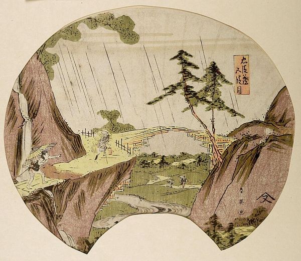 Editor: This is Utagawa Hiroshige’s woodblock print, *Night Rain at Koizumi*, part of the series *Eight Views of Kanazawa*. The rain is so heavy, it’s almost oppressive. What symbols do you see at play here? Curator: Notice how the driving rain veils the landscape, connecting the terrestrial and celestial realms. Rain in Japanese art is often associated with purification, renewal, even sorrow. Consider the cultural memory of the monsoon season. Does the rain evoke such feelings? Editor: I see it! The rain is a visual link to shared cultural experience. Thanks. Curator: Indeed. Symbols echo and transform across time.