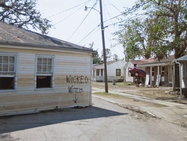 Curator: Richard Misrach's "Untitled [New Orleans and the Gulf Coast, 2005]", possibly created between 2005 and 2010, captures a street scene that's rife with unspoken narratives about loss, resilience, and community. Editor: My gut reaction is that it feels… raw. Like looking at a scar, you know? It’s messy and visceral. All those words spray-painted everywhere - urgent and desperate. Curator: Absolutely. This work exists within a tradition of street photography but speaks profoundly to themes of abandonment and survival in the wake of Hurricane Katrina. We see this through the lens of socio-political structures, questioning how disasters disproportionately affect vulnerable populations. The graffiti, "Food and dogs, waiting, not leaving," points to a communal resistance. Editor: Right? I mean, 'waiting' feels key. It's a frozen moment in time, that suspension. I'm also intrigued by the amateurish scrawl of those painted messages - "5 dogs... dead dog, dead bird"... it speaks to trauma. What happens when systems fail people, right? Curator: Exactly, it’s not just documentation; it’s a visual document of marginalized voices articulating their experience in real-time. The text transforms mundane objects—the van, the house, the car—into canvases of communal grief and anger. Editor: Grief is right. It feels almost punk, that defiant graffitied declaration, "Not leaving." What strikes me is this interplay between chaos and stillness, all under this washed-out sky. Curator: Precisely. Misrach allows us to contemplate these fraught spaces. In many ways, "Untitled [New Orleans and the Gulf Coast, 2005]" pushes us to engage with the long shadow of environmental disaster and social inequality. Editor: It's definitely haunting and hard to turn away from. Makes you consider the human element, the stories behind these… declarations. I'm still stuck on that 'waiting' part. Curator: Ultimately, this photograph makes the viewer question not only the impact of devastation, but also consider collective resistance. Editor: Well said. It invites reflection—both uncomfortable and necessary.