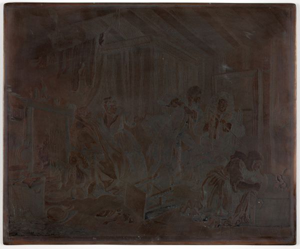 Editor: This is "Zwarte man en vier witte mannen voor een tent," made sometime between 1844 and 1874 by Willem Hendrik Stam. It's a print, using etching and engraving techniques, and currently residing here at the Rijksmuseum. It's quite dark, and difficult to make out. What stands out to me is the tension in the scene; what do you make of it? Curator: Given its material – an etching – we need to think about the process. Stam, as an artist, has made decisions here, to reveal some of the figures while shrouding others in darkness. Etching, engraving; the labour involved. It would be crucial to understand *where* he created this work; what access did he have to materials? Was this mass produced, or for a specific patron? It is fascinating to consider the production aspect - how this print comes to be circulated, bought and sold. This can tells us as much about Dutch colonial society and its representation as does the scene depicted here. Editor: That's fascinating! So you're thinking about the accessibility of art and its connection to class. But about the scene... Curator: And labour conditions, don’t forget. If we examine closely the contrast of the medium - the means of production here - versus what the market expects and enjoys - how complicit might Stam be with cultural consumption that relies on this visual dynamic? Are these mass-produced images supporting power dynamics of the era, regardless of Stam's own beliefs? The labour behind creating such works might be obscuring certain power structures at play. It’s all interlinked. Editor: I see what you mean. Looking at the print through that lens changes my perception quite a bit. Thanks for opening my eyes to those layers! Curator: Precisely; focusing on materials and means challenges us to see beyond the surface. We need to remember this piece is a result of labor and choices, existing within and commenting on the wider world around it.