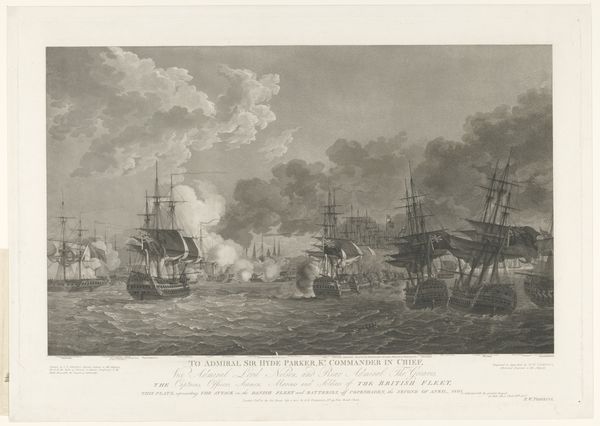 Curator: This print, crafted by Pierre Charles Canot in 1759, depicts "Zeeslag waarbij de Engelse vloot de Fransen verslaat op 21 oktober 1757," a naval battle in which the English fleet triumphed over the French. It's currently held in the Rijksmuseum. Editor: It immediately strikes me as dramatic, almost operatic. The ships, positioned against a churning sea and smoky sky, appear caught in a moment of intense conflict. There is an energy to this scene. Curator: Absolutely. Consider the era. Naval power was deeply intertwined with colonial ambitions, mercantile success, and the brutal realities of statecraft. Each ship functioned as a mobile piece of territory and economy. The battle is thus not just a clash of warships but a pivotal struggle for dominance, involving trade routes, land, and political leverage. Editor: I find the smoke from the cannons visually fascinating. It obscures, revealing at the same time. Like a visual metaphor of war and how events become obscured. How is truth shaped during this period? Curator: Precisely, consider also the symbolic weight of flags— emblems of power and nationhood displayed assertively in naval warfare. The artist pays particular attention to details on sails, hulls, and crew arrangement conveying maritime technological advancements—elements intertwined with empire-building and global trade. Editor: Beyond that, consider how ships are historically understood as containers or carriers of identity. Ships symbolize nation and movement, a conduit connecting worlds across distances. The bodies within the boats—consider the lives onboard, from those commanding down to sailors—each contributes, albeit sometimes through forced labor, towards these expansive political and financial aims. Curator: That’s very insightful. And these kinds of victories significantly influenced policy at home and abroad impacting societal stratification, legal codes governing commerce, and justifying further imperialist ambitions rooted in race, resource allocation, and national identity. The engraving then provides us with a single framed moment that continues far beyond this event. Editor: Right. In looking at it now I consider these scenes became ways through which political leaders solidified power, narratives were born. It prompts one to remember visual storytelling can normalize or excuse historical wrongs as well. Thank you.