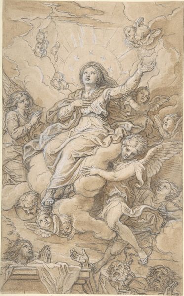Editor: This drawing, "Madonna and Child Among the Clouds," made sometime between 1500 and 1600 by an anonymous artist, really strikes me. The soft charcoal rendering gives it an ethereal, almost dreamlike quality. What catches your eye when you look at this piece? Curator: The symbolism is, as always, deeply compelling. Clouds in Renaissance art often signify the divine realm, elevating the Madonna and Child. Notice the expressions on their faces and the surrounding cherubs. Do they suggest anything to you about their relationship or their future? Editor: They look peaceful, even serene, but there's also a sense of foreboding, maybe because of the somber tone of the charcoal. It isn’t quite the joyous celebration I expected. Curator: Exactly! The artist might be subtly referencing the suffering to come. Consider the Madonna as Mater Dolorosa – the sorrowful mother. That archetype permeates much religious art, layering joy with premonition. Editor: That makes so much sense. The drawing’s beauty belies a deeper, more complicated emotional story. The anonymous creator used very simple art supplies but left us with very complex symbolic meaning. Curator: Yes, and this kind of drawing demonstrates that sometimes the most enduring symbols come from the simplest tools and profound emotions. Understanding them can lead to profound insights.
