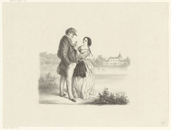 This lithograph, "Robert Burns and His Highland Mary" was made by Nathaniel Currier in the United States during the 19th century. It depicts the Scottish poet Robert Burns with his lover, Mary Campbell, known as Highland Mary. The image creates meaning through sentimental visual codes which spoke to the cultural values of the time. Burns, a figure of working-class origin, had become a symbol of romanticism and national pride, making him a popular subject for art and literature. Currier and Ives capitalized on this popularity by producing affordable prints for a growing middle class eager to consume art with accessible, romantic, and sentimental themes. The portrayal of Burns and Mary in a pastoral setting reinforces the romantic ideal of love found in nature. The work also subtly comments on the evolving social structures of its time, as it celebrates a working-class figure like Burns, thus appealing to a broader audience. To fully understand this work, historians might research the publishing industry of the time, popular literary themes, and the reception of Robert Burns in American culture. Ultimately, the meaning of this print is contingent on the social and institutional context in which it was created and consumed.
