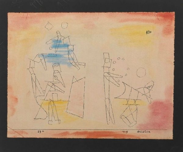 Curator: This intriguing work is titled "Color-Space Field Diagrams" by Stuart Davis. The piece, whose date remains unknown, resides here at the Harvard Art Museums. Editor: It’s like a secret code! The simple shapes and colors create this playful puzzle... I wonder what it unlocks? Curator: Davis was fascinated by relationships. Notice how the diagram implies an analogy between color, field, and observation. These visual cues trigger psychological interpretation, inviting a dialogue between color and space. Editor: A conversation between colors, I love that! It feels almost like a map, charting a course through abstract thought. Curator: Indeed. The diagram is an insightful prompt for anyone to consider their own subjective experience of color relationships. Editor: It all feels quite foundational. Davis' sketch has left me wanting to build up something from it myself.