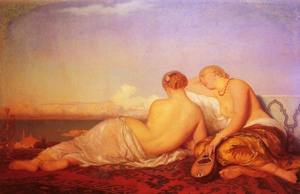 Editor: We're looking at William Etty's "Study For A Family Of The Forests", an oil painting. It feels quite classical in its composition, with the figures set against a vibrant landscape. What do you see in this piece? Curator: I see a complex negotiation of power and representation characteristic of its time. Etty, while celebrated for his nudes, operated within a patriarchal system. How does the positioning of the female figure –reclining, gazing upwards– speak to prevailing societal views on women and their roles, even in what appears to be a natural, idyllic setting? Editor: I hadn't really considered that. I was mostly drawn to the colours. Is there anything to be said about those? Curator: Absolutely. Think about the juxtaposition of the cool blues and greens of the landscape with the warmer tones of the figures' skin. This contrast not only draws the eye but could also symbolize a tension between nature and culture, or even the internal and external lives of the subjects. And the very title pushes on a "family" - what norms of behaviour is that calling on and maybe bending? Editor: So it's more than just a pretty picture, there's a whole discourse on gender and power dynamics going on? Curator: Precisely. And Etty’s use of the nude figure allows for a certain freedom of expression but also carries the weight of historical and social context. It forces us to question what's being revealed, what's being concealed, and what power structures are at play within the gaze. What do you take from that title, "Study for a Family of the Forests"? Who gets to be in that family, who is missing? Editor: I definitely have a lot more to think about now. Thanks! Curator: My pleasure. Art is never just about what you see, but how you see it, and through whose eyes.