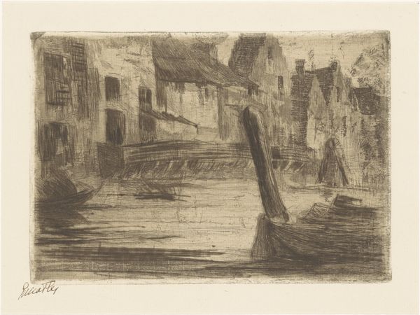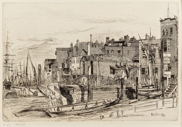 Curator: Muirhead Bone's 1915 etching, "Construction of an Underground," is before us. Editor: Immediately, I feel a sense of controlled chaos, almost like peering into the raw, vulnerable heart of the city. The composition has a curious density to it. Curator: Bone's use of line, varying in weight and density, really constructs the image, wouldn't you agree? It is quite structured in how it evokes the city’s verticality. Note the way he balances positive and negative space to draw the eye, directing it from the intricate scaffolding at the lower register to the architecture towering behind. Editor: The tall architecture with its spire stands like a symbol of aspiration amid all of this industrial commotion, a nod to enduring values while the city itself undergoes dramatic transformation. Curator: Yes! Observe how the underlying geometric forms shape the whole construction. The rigid, almost Cubist-like fragmentation captures a sense of dynamic progress and also highlights the sheer mechanics of modern urban development. Editor: Indeed. It reflects a common sentiment in art from this time: humanity is re-shaping nature, quite violently at that. Do you see how the artist embeds subtle symbols? This could be read as an expression of industrial progress marching steadily towards a new era. The deep gouges of the construction site and allude to larger cultural themes around regeneration and modernity. Curator: It's certainly a potent, almost melancholic, document of that shift. Bone uses a reductive tonal palette, but also leverages subtle light-dark contrasts—especially where it peeks from beyond the walls, that serve the composition, emphasizing linear contours in the overall design of the picture. Editor: I concur; after having studied this artwork with you, I come away with an image that seems not so much a picture of reality but one of latent hope, an allusion towards humanity’s determination despite such unsettling construction, where past values meld with a futuristic ambition. Curator: Very eloquently observed, Editor. Bone successfully weaves together these tangible elements of architecture with intangible sentiments on modernization and its consequences.