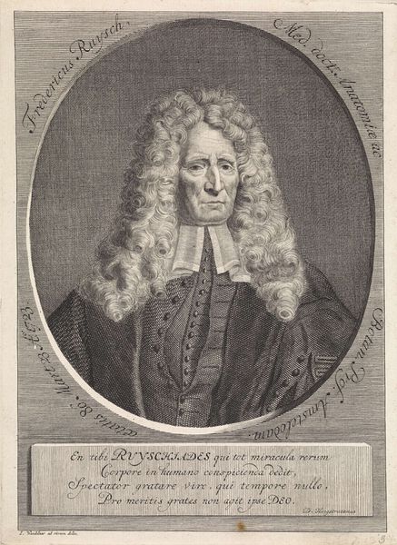 Curator: Oh, he looks like a serious sort! Stern, even. Almost… Shakespearean, though much later. It has a distinct Baroque flair, and, dare I say, an energy—what's your take? Editor: Well, it certainly strikes me as a piece deeply rooted in its materiality. This is a 1719 engraving, a print to be exact, titled *Portret van de predikant Johannes Hermanus Manné,* created by Gilbert Schoute. Imagine the labor, the precise movements needed to carve those lines into the metal plate. And what about the availability and consumption of paper at this moment in time, not just art historical trends? Curator: True, the act of printing itself holds significance. But the subject also evokes feeling. Manné—this preacher seems incredibly self-assured. I picture him delivering booming sermons, his words carefully etched into the minds of his parishioners. Note his hand gestures: he’s got the bible open to share it but also extends an open hand to the viewer. What do you read from that pose? Editor: Absolutely, and those printed words are just as physical! The combination of text and image reinforces Manné’s authority as a Lutheran minister, creating an artifact meant for widespread distribution, literally and figuratively. So many layers in the process from drawing and incising to the act of printing. Consider the economic side, was this just for friends and family, or made for profit and consumption to be sold for the benefit of his family. It makes one wonder. Curator: He has these big round white collars... the print catches his features well! One thinks of the countless prints, distributed in homes or pamphlets, that have helped influence political will and movements in general across time and cultures... so here’s Manné, etched forever! He does, certainly, live up to what society and culture deemed a 'good' minister looked like, right? Editor: Precisely! Each impression served a social purpose, disseminating a particular vision of religious authority and social order that's embodied in Manne! Thinking of the artist too - what are Schoute's influences for such fine detail in the folds of the fabrics... Curator: Right, one tiny, and quite reproducible artifact that can speak to us centuries later… Remarkable, isn't it? Editor: Indeed. An artifact holding worlds within its layered means of making.