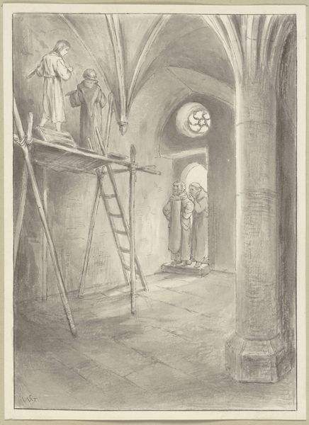 Jean-François Millet created "The Maternal Precaution," using etching around 1860. The print captures a humble domestic scene dominated by the textural contrast between the rough stonework and the soft, rounded forms of the figures. Millet uses the etching technique to explore themes of rural life and motherhood, structuring the image through contrasts in light and shadow. Note how the dark doorway frames the central figures—a mother carefully wrapping a child. Her gesture, rendered with delicate lines, underscores the tenderness of the moment. To the left, another child stands passively, a stark contrast to the active scene at the door. The composition, with its simple, unadorned setting, echoes the Realist movement’s focus on the everyday experiences of the working class. Millet elevates this maternal act to a scene of universal significance. The use of line and form invites us to consider the value of labor and family, which can be seen as both a social commentary and a celebration of human connection.