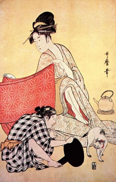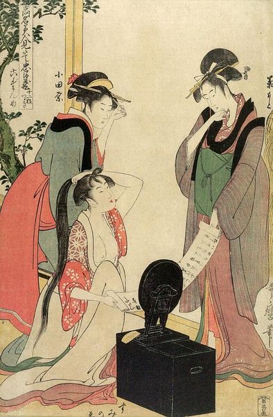Curator: This Ukiyo-e print, whose creator is thought to be Kitagawa Utamaro, invites us into a private world. I must say that its title, if my interpretation holds true, strikes me as fairly evocative: "The Hour of the Dragon." Editor: The light, almost ethereal palette definitely clashes with the intimate scene. It feels both vulnerable and exposed somehow. Is it a bedroom? Or a stage? The pale background just refuses to tell. Curator: Ukiyo-e, "pictures of the floating world," often celebrated beauty and fleeting pleasure. What unfolds here uses erotic art to show intimacy as performance—we, the viewer, become voyeurs, gazing at two figures from the Yoshiwara district—with one being attended to, in what appears to be a very specific moment of ministation. Editor: This attending...is that a form of care, control, or perhaps a more intricate dance of desire? Look at how deliberately the patterns of their kimono are rendered – spirals meeting geometric floral outbursts. What do they tell us? Curator: It's not merely about depicting physical intimacy. The floating world’s reflections provide an ephemeral mirror, a transient refuge. It underscores fleeting existence, but, I suspect, reveals the woman attending with compassion as well as dutiful habit. Editor: The detail is compelling. Like, notice the fallen hair ornaments and what seems to be an abandoned sake cup! Each symbol whispers its own secrets about social and sexual interactions in 18th-century Edo. I imagine these prints as gossip conduits, stories circulated among connoisseurs. Curator: Exactly, dear friend! Each viewing unlocks layers, reveals shifting interpretations. In fact, you can observe visual and allegorical cues around feminine virtues—the "hour of the dragon" refers to the fifth sign of the Chinese Zodiac and aligns to themes of fate, energy, luck and even royalty. Utamaro presents it all in delicate visual shorthand. Editor: What strikes me most is how Utamaro handles intimacy. It's a potent dance between revelation and concealment—between surface pattern and emotional interiority. You know, sometimes art unveils the familiar—so that it appears freshly strange. I believe Utamaro succeeded wonderfully here. Curator: A final reflection for me revolves around visual textures: what is printed upon the paper versus the interior experience held and known solely between the women? Indeed, much is left unspoken—yet powerfully felt.
