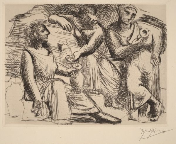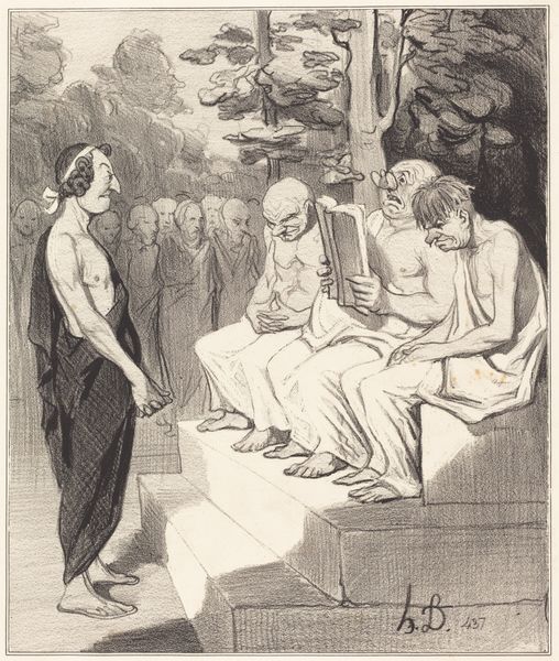 Honoré Daumier sketched this lithograph "Charmant... trainant tous les coeurs après soi..." in 1839, a period of significant social and political change in France. Daumier, known for his satirical commentary on French society, particularly during the July Monarchy, uses his art to critique power and pretension. Here, two figures, possibly representing characters from classical literature or theater, are rendered with exaggerated features. One, presumably the object of admiration, appears aloof and awkward, while the other gazes upward with a mix of longing and absurdity. The emotional intensity of the scene is heightened by the stark contrast in their expressions and body language. Daumier's choice of lithography, a medium accessible to a wider audience, underscores his commitment to social critique. The exaggerated features and dramatic gestures challenge traditional representations of beauty and heroism. "Charmant..." serves as a commentary on the absurdity of human desire and the performative nature of social roles.