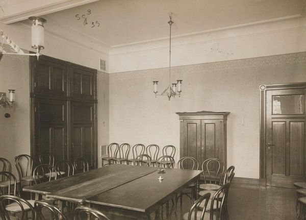 Editor: This photograph, titled "Social Settlements: Germany. Hamburg. Volksheim: Volksheim, Hamburg, Germany: Club Room" by G. Koppmann & Co., shows an austere meeting room. I'm struck by the sense of order and quiet. What can you tell me about the historical context of this image? Curator: This photograph provides a glimpse into the German social settlement movement. "Volksheime," or "people's homes," were intended to be community centers. How does the image, with its books and structured seating, speak to the goals of these settlements in promoting education and social reform? Editor: It feels almost…institutional, not exactly welcoming. Curator: Exactly! It's worth considering whose vision of "community" is reflected here. Was it a truly democratic space, or did it subtly reinforce existing power dynamics? The presence of the bust also suggests a certain elevated cultural aspiration. Editor: That makes me reconsider my initial impression. It’s more complex than just a quiet room. Curator: Right. By interrogating the visual language, we can uncover the nuances of social progress.