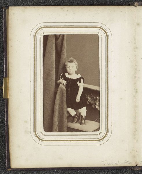 Curator: Alright, let's dive into this enchanting piece, "Portret van een meisje met pop en hoed," believed to be captured sometime between 1860 and 1880 through the magic of photography. Editor: My initial reaction? There's this overwhelming feeling of quietness, almost a contained breath. The girl's posture and gaze suggest a solemnity far beyond her years, set against the soft, sepia tones that speak of time itself. Curator: Absolutely. Looking at the interplay of light and shadow, you immediately notice the rigid composition; it mirrors the societal constraints placed on young girls during that era, where expectations and appearances mattered immensely. Editor: I'm intrigued by how her formal attire juxtaposes with the doll she cradles. The doll seems almost like a prop, emphasizing her youth while her clothing forces her into a miniature adult role. It's a poignant commentary on lost innocence, isn't it? Curator: It’s also fascinating to consider photography at this stage. Each exposure demanded a stillness that becomes almost palpable. That controlled breath you noticed, that rigidity, comes from the medium as much as the social context. It demanded something from the sitter and imposed itself on the outcome. Editor: Do you think there is any relationship between that stillness and the almost hyper-realistic representation of clothes texture? How fabrics are presented here emphasizes materiality against ephemeral existence of things. Curator: Indeed. This is genre painting at its best: using domestic scenes to explore historical concepts in novel ways. It’s a little time capsule but one with subtle suggestions for something more. Editor: This photo whispers more than it shouts. The quiet details make us consider all of its implications. Curator: Exactly. It's a silent observer, offering us glimpses into a world defined by grace, composure, and unspoken realities.