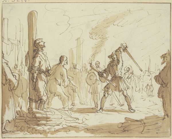 This drawing, "Lot and his Family Leaving Sodom", from an anonymous artist, was created with pen and brown ink, on paper. The artist uses the fluidity of the ink to convey the drama of the scene. The thinness of the lines suggests a quick, spontaneous execution, perfect for capturing a moment of crisis. Notice how the artist uses varying line weights to create depth and shadow, adding to the emotional intensity. The texture of the paper itself plays a role, with its slight imperfections enhancing the overall sense of immediacy. Drawings like these were often studies for larger works, or autonomous works in their own right. The artist is not using precious materials, but the kind of paper and ink that would have been common in a workshop. It’s a reminder that even the most powerful stories can be told with simple means, elevating the everyday into something truly meaningful. The value lies not just in the finished product, but in the artist’s labor, skill, and creative vision.