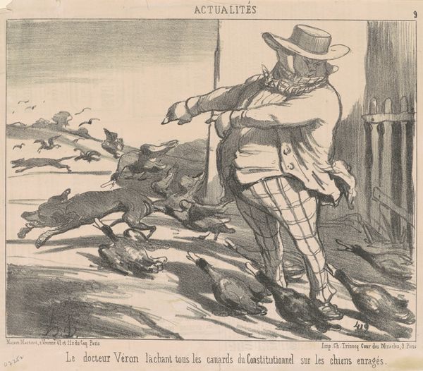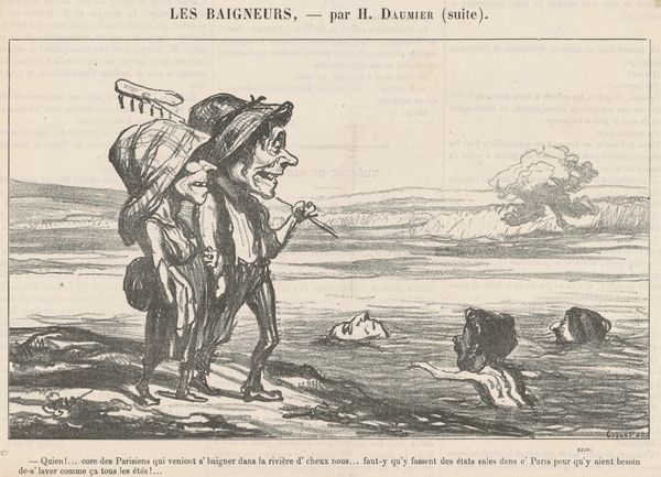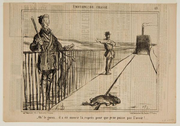 Curator: This lithograph, created by Honoré Daumier around the 19th century, presents quite the sardonic narrative. The title, "Oh! Le gueux ... il a été mourir la ...," translates to something like, "Oh! The rascal… he died there..." Editor: My initial impression is a sense of stark contrast, literally in the shades of ink, but also between the exaggerated figures. The sharp diagonal of the railway line leads my eye directly to the looming train in the background. There is a theatrical dynamism conveyed. Curator: Daumier's choice of lithography is significant here. It's a printing process that allows for quick reproduction and dissemination, making it a potent tool for social commentary. The caricature style allows him to exaggerate features and amplify the emotional impact. We should consider Daumier's prolific output, much of which satirized the bourgeoisie and commented on the rapid changes in Parisian society. The material of ink on paper here becomes the battleground for social commentary. Editor: Agreed. And yet, despite the overt social critique, look at how Daumier employs line. The repeated verticals of the bridge on the left oppose the unwavering horizontals elsewhere. The whole scene, with its ironic subtitle, offers this brilliant study of frustrated ambition and missed opportunities. The dead hare skewered on a rail speaks of more than just the failed hunt. Curator: Precisely. The dead rabbit is clearly meant as a criticism towards the French upper class and its failed ambitions and economic inequities. The labor and raw material, and the processes to bring it to the audience. Editor: I see. So by looking at it formalistically you observe how the composition guides our attention. While materialistically, the class conflict are apparent by viewing it that the subject is for consumption, especially considering the choice of medium. Curator: Exactly. Daumier leverages lithography, making art accessible beyond the elite, thus challenging traditional boundaries between high art and craft, allowing mass access for consumption and discourse. Editor: Seeing it both ways opens it up to so many interesting readings of the artist, its formal qualities, and its context in 19th-century France. A single, static reading does not reveal the artwork as successfully. Curator: Yes, analyzing its material process brings clarity to the commentary Daumier intended, while close readings of it is how it succeeds formally as a striking political image.