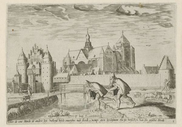 Pieter Bast created this etching of Het Kasteel Aldegonde in 1598, using the labor-intensive technique of etching. The process begins with a metal plate, likely copper. The plate is coated with a waxy, acid-resistant ground. Bast then used a sharp needle to scratch away the ground, revealing the metal beneath. When the plate is dipped in acid, the exposed lines are eaten away, creating grooves. Ink is then applied to the plate, filling these grooves, and the surface is wiped clean. Finally, the plate is pressed onto paper, transferring the ink and creating the image. The success of the etching depends on the artist's skill in manipulating the materials, controlling the depth of the lines, and ensuring a clean transfer. The lines are precise and controlled to capture the architectural detail of the castle, and social life around it. Bast's etching demonstrates the importance of the hand in the age of mechanical reproduction. The labor of producing the image is clearly evident in the final print.