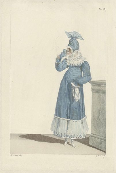 Georges Jacques Gatine made this print, "Incroyables et Merveilleuses, 1813, Merveilleuse, No. 15" in 1813. It's a hand-colored engraving, which means the image was etched into a metal plate, then printed and painted. The fashion depicted embodies post-revolution extravagance, with its emphasis on voluminous fabric, lace, and ornamentation. This aesthetic relies on specialized labor; from growing and weaving the cloth, to the intricate lace-making. Look closely at the layers of lace embellishing the dress. These details weren't just decorative; they were potent indicators of wealth and status. Each tiny stitch represents hours of labor, transforming simple thread into a status symbol. This is a direct reflection of the social and economic structures of the time. Considering these contexts helps us to see beyond the surface of fashion, revealing its deep connections to labor, politics, and consumption. It blurs the boundaries between fashion, craft, and art.