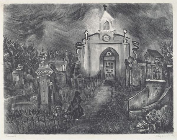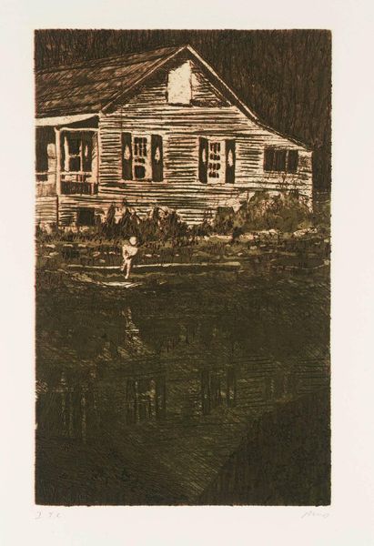 Editor: This is "Victorian Carriage House" by Lawrence E. Kupferman, currently held at the Harvard Art Museums. It has such an eerie feeling. What do you make of the composition? Curator: Note the architectural details. The heavy emphasis on line and texture to create a sense of decay and perhaps even instability. Kupferman uses hatching to establish the chiaroscuro. How does this treatment affect your reading of the subject? Editor: It emphasizes the darkness and dilapidation, which contributes to the feeling of unease. I see how the formal elements really shape my interpretation. Curator: Precisely. The very structure of the image supports the emotional impact. Editor: I hadn’t thought about it that way. Thanks! Curator: A pleasure. Always look closely at the formal elements.