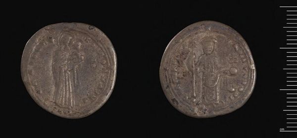 Editor: Here we have a coin, attributed to Leo III, whose authenticity is questioned. The wear and the stark imagery give it a sense of history bearing down on us. What can you tell me about the visual symbols used here? Curator: The symbols are potent. The cross, for instance, isn't merely religious; it's a marker of Byzantine identity, of power, and a claim to divine mandate. Even the emperor’s attire reflects carefully coded messages of authority. How might this imagery be perceived across different eras? Editor: I guess what's powerful to some could be oppressive to others. It's strange to think of a coin as a form of propaganda. Curator: Precisely. Coins like these carried immense weight. They were visual statements, reinforcing power structures. Considering its questioned authenticity, what aspects might a forger emphasize or misunderstand? Editor: That's a fascinating lens through which to view it. Thanks! Curator: Indeed. These tiny objects unlock vast histories of cultural memory.