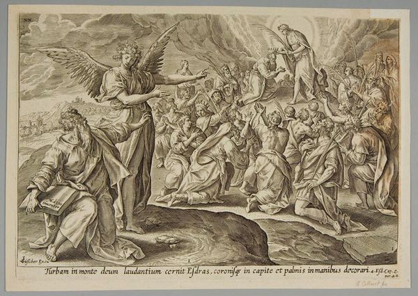 Editor: This is "Scene from the Book of Esdras" by Hans Collaert the Younger. It's an intriguing print; the angel's assistance and the woman's radiance seem to highlight the male figure's vulnerability. What can you tell me about this scene's significance? Curator: This work engages with the Apocryphal text of Esdras, often left out of canonical biblical narratives. The angel’s support and the woman’s divine light challenge patriarchal interpretations that have historically dominated religious art. Editor: So, the artist is potentially critiquing established power structures? Curator: Precisely! The choice to depict this particular scene and these figures in this way could be interpreted as a subtle act of resistance, questioning traditional gender roles and highlighting marginalized voices within religious discourse. What do you think? Editor: I never considered that! Seeing it as a commentary on power shifts the way I understand the artist's intentions. Curator: Exactly! By examining art through a lens of social and historical context, we uncover layers of meaning that challenge dominant narratives. Editor: It really makes you question everything.