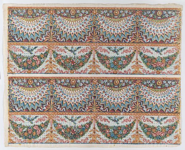 Curator: Here we have "Sheet with five borders with floral and striped patterns," created by an anonymous artist sometime between 1800 and 1900. It’s currently held at the Metropolitan Museum of Art. Editor: My first impression is a gentle fading beauty. The repetitive nature of the floral and striped design creates an overall calming effect, despite the verticality. I’m also quite drawn to its materiality, looks like it may have been used for textiles. Curator: Indeed. Note the structured layout—the way the stripes and floral motifs alternate create a visual rhythm, further supported by its inherent geometry. Observe how the artist organized discrete floral and striped components to make the whole greater than the sum of its parts. It offers a formal cohesion. Editor: Thinking about textile production back then, imagine the labour invested in creating patterns, maybe block-printed, onto fabrics. The social context, particularly within artisan workshops, informs the reading of it today, where such repetitive tasks would probably be done with mechanized solutions. It does make me consider it within historical production networks and labour relations during this period. Curator: Intriguing how the material aspect intertwines with semiotics. Those blue flowers, interspersed with golden bands, echo the cyclical patterns in nature—growth and decay. In terms of form, notice the conscious utilization of negative space, providing a delicate balance. It speaks to enduring principles of design. Editor: Definitely. Consider the textile trade back then – these patterns reflect trade routes, global exchange, and the availability of materials. We see the flow of materials, labour, and finished products influencing both art and commerce. It serves as more than just ornamentation. Curator: And so, we arrive at a point where aesthetic contemplation meets a narrative about economic activity and artisanal creation. Editor: Indeed. A delicate piece like this reveals layers of historical engagement, reminding us that aesthetics are intertwined with labour, economy, and social life.