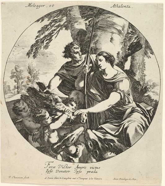 Curator: This etching by François Chauveau, "Meleager and Atalanta," made between 1638 and 1648, is a fascinating example of Baroque printmaking. The swirling lines and dramatic scene have a definite energy. What strikes you about this piece? Editor: Well, the circular composition is interesting, and the detail achieved through etching is impressive, but what’s more engaging to me is the combination of classical figures with these playful cherubic forms, a very clever connection! I'm curious about the process of creating it. How was this sort of intricate detail achieved back then, and how did it fit into the broader art market? Curator: Excellent questions! We should focus on the labor involved. Etching demanded significant skill and time, requiring the artist to meticulously transfer the design onto a metal plate covered in wax, then use acid to bite away at the exposed areas. This was painstaking work. These prints became accessible commodities, think of the labour reproduced and consumed within this scene. Consider too the social implications: were these images aimed at specific patrons? Did Chauveau operate within a guild system? Editor: That’s interesting. The idea of accessible art brings a question: what about the choice of materials? Would cheaper materials influence accessibility? Curator: Exactly! Paper quality, ink types— these affected price points and, thus, the accessibility. We should investigate the social status of printmakers relative to painters or sculptors at the time to reveal insights into artistic labor’s value in 17th-century France. The relationship between production, material, and value, helps uncover so much about artistic economies of the Baroque era. Editor: Thinking about it this way shifts my perspective completely. Instead of just admiring the image, I'm thinking about the artisan's hands, the supply chain of materials, and the consumer for whom it was intended. It makes the artwork far more complex. Curator: Precisely! Now we have an angle of production to consume this scene with, adding value far beyond its initial glance!