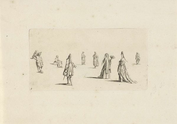 This print, "Kleding voor heren," by Daniel Nikolaus Chodowiecki, presents us with a study in contrasts through its structured composition. Executed with fine lines, the artwork depicts four distinct modes of male attire, each confined to a separate quadrant. The arrangement invites a semiotic reading: each figure, distinguished by dress, acts as a signifier of social role and status within the 18th-century Berlin context. Chodowiecki employs line and form to denote differences in class and occasion, from gala to parade dress, each costume carefully delineated. This visual encoding speaks to the structuralist notion that cultural phenomena can be understood as systems of signs. The print subtly destabilizes rigid social categories. By presenting these distinct "types" within a unified frame, Chodowiecki encourages viewers to consider the constructed nature of identity and the fluidity of social roles. The very act of categorization implies a system of inclusion and exclusion, a discourse on the performance of identity through clothing.