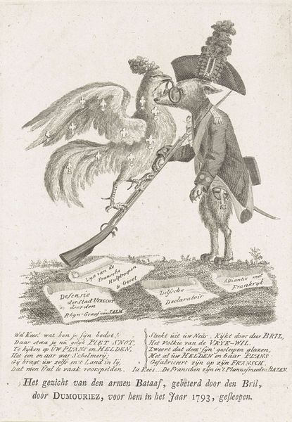 Curator: My first impression is just utter chaos, a whirlwind made visible! There's a wildness and humor in it, almost like a Looney Tunes episode unfolding. Editor: I love that observation! Let's contextualize. We're looking at "A Tailor in a High Wind," an etching created around 1819 by George Cruikshank. Currently it is at the Art Institute of Chicago. It is a fascinating example of social satire, a genre very much en vogue at the time. Curator: Ah, satire makes sense. Is the figure meant to represent someone specific? Editor: While not a direct portrait, many believe it mocks the nouveau riche, individuals aspiring to a higher social standing, hence the alternate title on the work which reads “L'embarras des richesses”. The tailor, caught in this blustery seaside scene, becomes a figure of ridicule. Notice the wild composition. Cruikshank employs a line-etching style to portray an exaggerated scene filled with symbolism. The man is struggling against both literal and metaphorical forces of nature. Curator: The details are so sharp and funny, everything about him seems precarious. Even his wig looks like it's about to fly off! And there are various objects in the air like hats, a wig and even his cloth! Is that little dog in the corner cowering? Editor: Exactly! Animals often symbolize base instincts or a deeper truth in art, and the cowering dog here certainly emphasizes the tailor’s foolish plight. What does all this frenzy bring to your mind? Curator: Well, this resonates with themes of ambition, delusion, and the perils of social climbing. It feels universal because it captures that very human tendency to grasp at things that are perhaps just out of reach, which in return often leaves us looking, well, ridiculous. It’s a stark reminder of our vulnerability in the face of both societal expectations and the unpredictable forces of life. Editor: I concur. In this blustery portrait, we are given both a glimpse of social history, and an insightful understanding of how persistent human drives are satirised for entertainment.