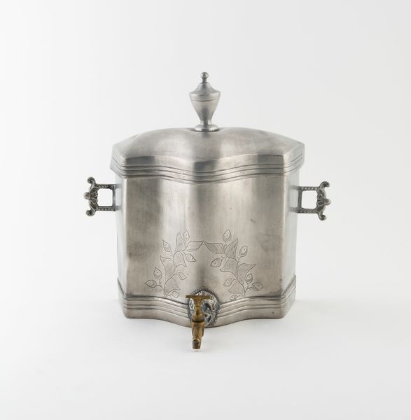 This individual coffee pot was made by Johann Traugott Böhme around the turn of the 19th century. Its cylindrical form, softened by a slightly domed lid and a gracefully curved wooden handle, presents a study in contrasts. The cool, matte texture of the pewter body—marked by subtle gradations of light and shadow—is juxtaposed against the warm, organic grain of the wood. The handle, with its bulbous end, extends horizontally, providing a visual counterpoint to the verticality of the pot itself. The pot's design, though functional, also serves as a commentary on the changing rituals of daily life. The individual size suggests a shift towards personal consumption. It reflects broader cultural and philosophical concerns regarding individuality and the evolving nature of domestic life. Its clean lines and simplified form embody an emerging aesthetic that values utility alongside beauty. The coffee pot does not offer a singular meaning but invites ongoing interpretation.