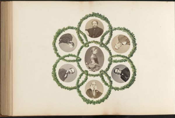Marie-Blanche Hennelle Fournier assembled this album page in France using albumen silver prints, watercolor, and gouache. It contains images of several well-dressed men and one older woman set amongst leaves and flowers in a woven basket. This arrangement of family portraits, set amongst the gentility of flowers, was a popular pastime for upper-middle class women in the mid-19th century. These albums provide us with a record of the fashions, cultural values, and social networks valued at the time. Through family portraits, women had control over the narrative of who they and their family were and how they wanted to be seen, crafting a very particular sense of self and their place in society. By studying photographs, garments, and social gatherings, historians can understand the cultural life of 19th-century France. The "Madame B Album" provides a glimpse into the lives of upper-class women and how they used art to define their social standing and personal identity.
