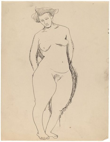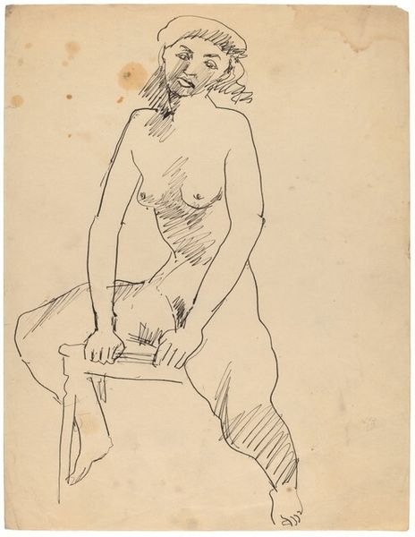 Editor: Here we have Mark Rothko's ink drawing, "Seated Nude Turned to the Right, Arms Resting on Thighs." The linework is so spare, yet it captures this weight and presence. What do you see in this piece from a formalist point of view? Curator: The essence lies within the stark linearity. Notice how Rothko employs contour drawing to define the figure, emphasizing the purity of form. The deliberate absence of shading creates a flattened space, pushing the subject forward. The strategic placement of lines, thickening in certain areas and thinning in others, suggests volume and texture without relying on traditional modeling. Editor: So it's about the lines themselves, not necessarily what they represent? Curator: Precisely. We're concerned with the syntax of the image. Consider the economy of line used to define the subject's face, contrasted with the slightly heavier marks describing the torso. Does this juxtaposition create a sense of visual hierarchy, guiding the viewer's eye? Editor: It does draw me to her face, almost as if searching for an emotion that isn’t explicitly there. Curator: The beauty lies in the semiotic potential within these elemental marks. The relationship between line, form, and void generates a tension that transcends simple representation. Editor: I see what you mean. I was focused on it being a nude, but actually the power comes from how Rothko reduced the body to these fundamental lines. Curator: Precisely. By reducing the figure to its essential lines, Rothko allows us to consider the intrinsic properties of the medium. Editor: That's a great point. Thinking about line as its own language definitely changes my perspective. Thanks!