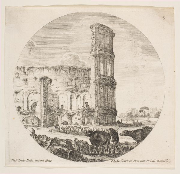 Editor: So this is Adriaen Matham's "The Palace of the Sultan of Morocco," created around 1646. It's an etching, and it feels quite formal, almost like a technical drawing because of the clean lines. How would you interpret its visual language? Curator: The immediate emphasis lies in its formal rendering. Observe how Matham constructs depth not through tonal variation, but through linear perspective and the meticulous repetition of forms. The walls, punctuated by regularly spaced crenellations, create a rhythmic pattern, framing the architectural elements within. The detailed cityscape in the background provides a layered and structural feel. Do you notice how this contrasts with the liveliness of the figures in the foreground? Editor: Yes, I see the contrast. The people are dynamic, but almost like small details adding a little life to an otherwise stoic design. The use of line really does emphasize the monumental architecture, like the tower and the walls themselves. Curator: Precisely. Note how the composition directs our eye towards the architectural structures. The precision and linearity, while seemingly detached, contribute to a powerful representation of space and form. The text frame adds a certain weight and reinforces the idea that there are layers of narrative at play within this landscape. Is that something that also catches your eye? Editor: It does, although the Dutch is tough for me to decipher. It almost creates another visual frame for the palace and city. Considering the artist's emphasis on linear composition, what meaning do you derive from that structural choice? Curator: In Matham's methodical portrayal, we see an attempt to capture the essence of the place through meticulous observation and geometrical organization. What appears to be a straightforward depiction transforms into an exploration of form, space, and visual construction. What did you take away from this print? Editor: I appreciate the discussion of the linework; I will pay closer attention to the structural elements and composition of the work rather than focusing solely on narrative. Curator: And, I must say, you provided new perspectives for me as well.