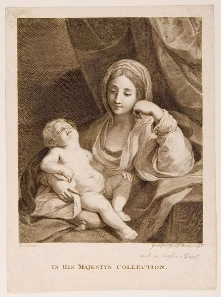 Editor: This is "The Virgin with the Child" by Cornelis Van Dalen, the Younger. I'm struck by the swirling lines of the drapery and the contrast between the darkness of the background and the light radiating from the figures. What do you see in this piece? Curator: Note the use of line and form to create a sense of movement and depth. The engraving technique allows for a remarkable range of tonal variation. What do you make of the composition's emphasis on curvilinear forms? Editor: I see how the curves soften the image and draw attention to the figures' tenderness. What does that tell us? Curator: It suggests a focus on the emotional and sensual aspects of the subject. Consider how this contrasts with more rigid, idealized depictions of the Virgin and Child. Perhaps the artist explores more humanistic themes. Editor: That's fascinating; I hadn't considered the emotional dimension so explicitly. Thanks for pointing out the subtleties in the composition. Curator: It's in these formal choices that the work speaks most eloquently.