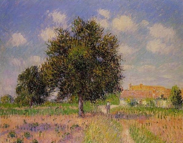Willard Metcalf painted "Flying Shadows," an oil on canvas, in the late 19th or early 20th century, during the American Impressionist movement. Against a backdrop of industrialization and urbanization, artists like Metcalf turned to nature, seeking solace and national identity in landscapes. The bright sky and verdant field can be understood within the context of a quickly modernizing America. Metcalf, like many artists of his era, romanticized the rural landscape as untouched and pure, a vision which often overlooked the displacement and marginalization of Indigenous peoples from these very lands. With its focus on light, color, and fleeting moments, "Flying Shadows" captures the ethereal beauty of nature. The open field invites you to step into the scene, to feel the sun on your skin and the wind in your hair. While formally pleasing, such landscapes participate in a longer history of idealizing nature.
