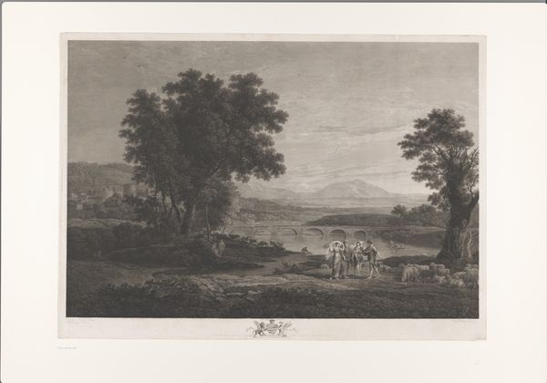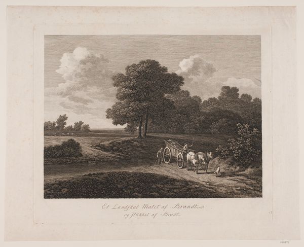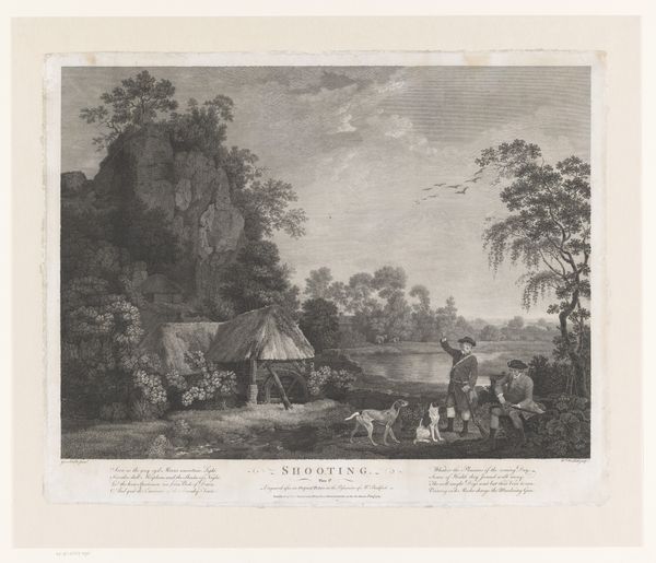 Curator: We are looking at a print titled "Twee jagers met honden lopen door een veld langs een huis," which translates to "Two hunters with dogs walk through a field past a house." It's an engraving by William Woollett, possibly dating from 1770 to 1778, held in the Rijksmuseum collection. Editor: It's remarkable how much Woollett conveys with such limited tonal range! The texture is fantastic. I notice the laid lines in the paper give this print an interesting dimensionality, and the house seems cozy somehow, like the cottage is sheltering something vital. Curator: It's evocative of its time. These idyllic scenes promoted a particular vision of rural life and gentry leisure that became popular among the rising merchant classes. Collecting prints like this allowed people to participate in the culture of the elite. Editor: Indeed, prints like this offer glimpses of the day-to-day realities of both humans and animals, like the energy radiating from those dogs. Can you imagine the collaboration and labor involved? From the engraver to the printer to the shopkeeper, not to mention the source painting if one existed, or the making of the paper itself. Curator: Exactly, and it’s not merely documentation. Look at the composition. The relationship between the hunters and their dogs is foregrounded, yes, but their small figures seem almost overwhelmed by the vastness of the landscape, almost a feeling of insignificance, a concept becoming common during the Romantic era. Editor: I find the materiality almost defiant. Look how that almost severe monochromatic palette can still convey such life, motion, texture… and the human urge to master the land. And consider the relative accessibility of an engraving like this compared to, say, a painting. More people had access to participate, in a small way, in owning some semblance of power over the environment. Curator: Absolutely. These images circulated widely and were influential in shaping perceptions of nature and social hierarchies. Thinking about who was buying them, displaying them, and how, really unlocks another layer of meaning. Editor: Agreed. Thinking about those means of production and consumption really gets you wondering: who really benefits from romanticizing the natural world? And even more, who is doing the labor behind making this beauty? Curator: A powerful reminder that art exists within, and is influenced by, a complex web of historical and social relations. Editor: It’s amazing what a simple hunt scene can reveal when you start to scratch beneath the surface of the materiality!