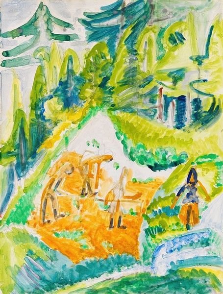 Curator: This work, dating back to 1927, is titled "Sketch of Decorations for Puppet Show 'The Rooster - Gold Scallop'." It's a lovely piece attributed to Boris Kustodiev, utilizing watercolor and tempera, and intended, it seems, for a stage backdrop. Editor: My first impression? Utter enchantment! It's like gazing into a whimsical fairytale. The colours seem so vibrant and the scene's spatial arrangement is oddly…stage-like! It’s playful but the overall mood feels strangely…contemplative, too. Curator: That "stage-like" quality is literal, of course. Kustodiev designed stage sets and theatrical costumes. There is a tradition of using very simplified scenography like this as an indication of folklore, as opposed to historical or modern content in the plays. Editor: It's fascinating how the simple shapes – those almost childlike renderings of the trees and hills – create such a convincing sense of depth and atmosphere. Is the grotto a symbolic image? Curator: Grotto, definitely. A dark entrance – perhaps it hints at a symbolic doorway to another realm or, a deeper self within. The cave represents a transformative space, especially for the characters involved. There’s a lot of history within Russian theatre using caves as archetypal and narrative symbolism. I appreciate that there's the contrast between the lively forest and that cave with a prison gate on the background. The juxtaposition could invite contemplation of confinement versus liberation. Editor: Indeed. There’s that balance too with folk art. Something profound masked in simple forms. And this specific intersection of folk tradition with the Russian Avant-Garde... it’s really powerful! I love how this sketch manages to compress so many cultural layers in a space so deceptively simple. Curator: For me, seeing pieces like these allows me to see just how interwoven various creative disciplines were in that period, the theater bled into the art and art into political design. This work helps me see it a bit more clearly!