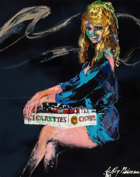 Editor: This is LeRoy Neiman's "Baccarat Dealer," created in 1980 using acrylic paint. It's a striking scene, full of energy and movement. What do you see in this piece that stands out from a materialist perspective? Curator: Immediately, the handling of acrylic jumps out. The thick impasto and vibrant colors suggest a rapid, almost performative process. Consider the shift from traditional oil painting and the increased availability and democratization of acrylics at this time. How does this choice of material reflect changes in artistic labor and the art market? Editor: That’s a really interesting point about the accessibility of acrylics. It’s not a medium associated with the elite. The scene depicted is also quite telling with a gambling environment and figures that would suggest wealth. Curator: Exactly. Neiman is capturing a leisure activity steeped in capital. How might the materiality of the painting, its quick, expressive application, intersect with the spectacle and consumption inherent in a Baccarat game? Does the gestural application of paint reflect the thrill, and risk, associated with the act of gambling? Editor: I hadn’t considered the paint application as mirroring the frantic energy. I see the bold colors and fast strokes adding to the overall impression of dynamism within a capitalist context. Curator: And beyond the individual materials, consider the context in which this was produced. The 1980s saw a surge in consumer culture and celebrity worship. Does the style and subject matter suggest an endorsement or a critique of the period's values through this medium? Editor: It makes you wonder about Neiman's position as an artist working within and commenting on that system. He’s not just depicting wealth but also participating in it by selling the depiction. Curator: Precisely. Understanding the materials and processes helps us unpack those complex relationships of labor, consumption, and cultural values inherent in this vibrant canvas. Editor: This perspective really deepens the meaning and lets us think about the piece critically beyond its surface.