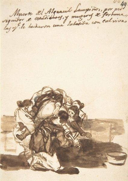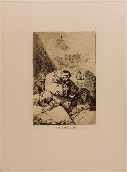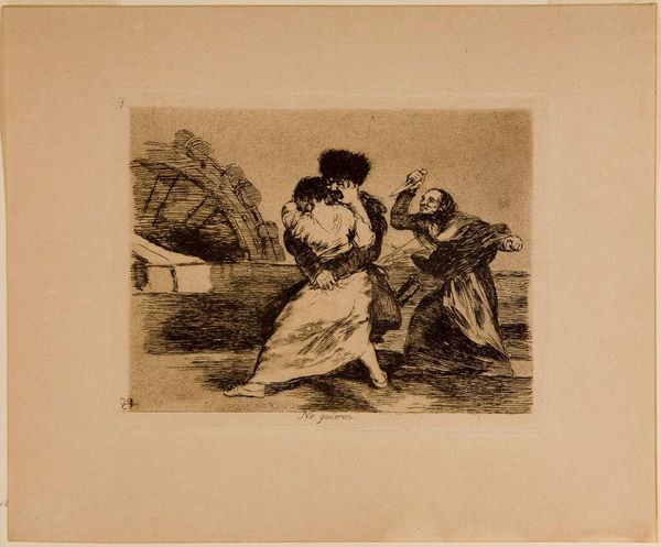 Editor: This etching by Goya, titled "Nor These Either," depicts a chaotic scene. The figures seem intertwined in conflict, almost as if they're part of a tragic dance. How do you interpret this work? Curator: This piece serves as a chilling indictment of violence, particularly during times of conflict. Goya was deeply critical of the social and political structures that enabled such brutality. How does this image speak to contemporary issues of power and oppression? Editor: I see parallels to current events, like the disregard for human life in war and the systemic inequalities that fuel conflict. Curator: Precisely. Goya isn't just showing us the violence; he's forcing us to confront the systems that perpetuate it. It is a reminder that we must remain vigilant against the forces that dehumanize and destroy. Editor: I hadn't thought of it that way before. It is a really powerful, thought-provoking piece.