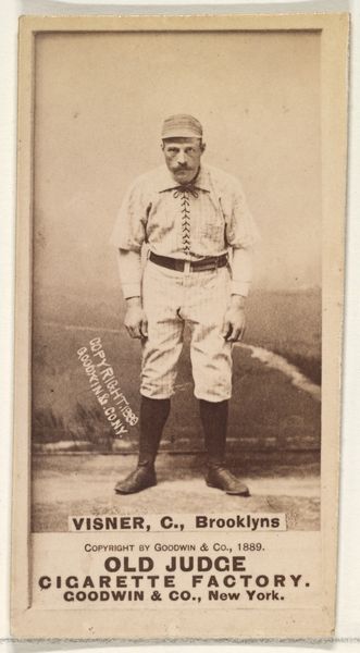 This small card, featuring Clark, Catcher for Brooklyn, was created by Goodwin & Company as part of the Old Judge Cigarettes series. These cards emerged during a time of rapid industrialization and urbanization in America. Baseball was becoming the nation’s pastime, but what did it mean to capture and commodify the players in this way? Consider that the image of Clark, a working-class athlete, becomes a tool for selling cigarettes. The card participates in the construction of celebrity, but also in a culture of consumption deeply intertwined with ideas of masculinity and the performance of gender. The image captures a moment of action, yet freezes it, transforming the player into a static object. It highlights the complex intersection of sport, commerce, and identity in late 19th-century America. Its intimacy invites us to consider the relationship between public image and personal identity.